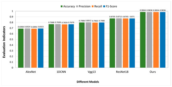 For a more detailed comparison, Table 7 shows the values of the four evaluation indicators and the statistical TOPSIS analysis results using different models. It can be seen that the recognition accuracies for AlexNet, 1DCNN, Vgg13, and ResNet18 are 69.08%, 76.88%, 79.88%, and 87.05%, respectively. In comparison, our model achieves the accuracy of 98.44%, which is a significant improvement of 29.36%, 21.56%, 18.56%, and 11.39%, respectively, compared to AlexNet, 1DCNN, Vgg13, and ResNet18. TOPSIS is an effective multi-indicator evaluation method, by which the optimal and worst values for each indicator can be obtained from all the values of each indicator, and then the distances from the point corresponding to each evaluation value to the optimal and worst points are calculated to obtain the overall evaluation value (represented by f in this paper). The larger the f-value, the better the evaluation indicators. For Table 7, it can be seen that our model has the maximum f-value of 1.0, and AlexNet has the smallest f-value of 0, indicating that our model has the best comprehensive performance for these four evaluation indicators.