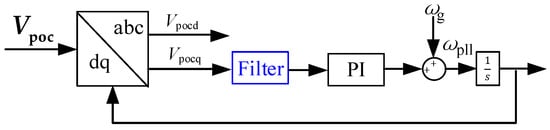 At present, the predominant synchronization control strategies for grid-connected converters involve proportional-resonant (PR) control in the αβ coordinate system [,,] and proportional-integral (PI) control with phase-locked loops (PLLs) synchronization in the dq coordinate system, attributed to the enhanced robustness of PI control. As a result, the PLL synchronization control strategy is uniformly applied across wind and photovoltaic grid-connected converters. Grid-connected converters employing PLL synchronization are also known as grid-following converters (GFLs). The current implementation of GFL heavily relies on PLL to monitor the grid-voltage phase at the point of connection (POC) for grid synchronization []. The voltage present at the POC is equivalent to the voltage output by the GFL. Consequently, the dynamic characteristics of the PLL significantly influence the grid-tied stability of the GFL []. References [,] advocate for integrating a filter into the PLL’s q-axis control loop to enhance the GFL’s stability, under minor disturbances in high harmonic grid environments. Moreover, the literature [] suggests the incorporation of a notch filter (NF) or multiple NFs into the PLL control loop to eliminate harmonic components selectively. Reference [] explores the use of a moving-average filter (MAF) within the PLL control loop, functioning as both a linear phase filter and, under certain conditions, an ideal low-pass filter. Additionally, in reference [], the investigation into repetitive regulators (RRs) within the PLL control loop demonstrates their efficacy in attenuating harmonic components and providing rapid dynamic responses to disturbances. Proposing delayed signal cancellation, reference [,] introduces the dq-frame cascaded delayed signal cancellation (dqCDSC) to enhance PLL’s phase-locking performance under high harmonic grid conditions. Additionally, in addressing approaches to attenuate grid harmonics, references [,] focus on leveraging the inherent control strategies of GFL. They introduce a cooperative control framework based on a hybrid algorithm, aimed at mitigating the adverse effects of grid harmonics on GFL performance. However, the studies mentioned above overlook the impact of inherent filter delay characteristics on GFL’s synchronization during significant disturbances.