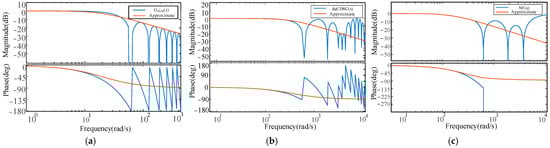 Bode plots of the filter transfer function and its first-order counterpart. (a) Comparison of GMAF(s) with approximate. (b) Comparison of dqCDSCn1,n2(s) with approximate. (c) Comparison of NF(s) with approximate.