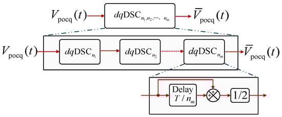 In (6), n represents the delay factor, where its selection can prevent certain characteristic harmonic components. In most scenarios, a single dqDSC operator might be insufficient to counteract associated harmonic components. Depending on the harmonic type in the grid and existing applications, multiple dqDSC operators with specific delay factors are usually cascaded. Equation (7) describes dqCDSC in the Laplace domain, where m represents the quantity of cascaded dqDSC operators. Figure 4 illustrates the time-domain implementation of dqCDSCn1,n2,…, nm.