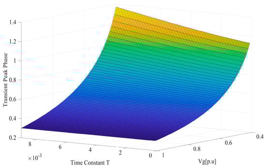The analysis conducted previously suggested that incorporating an inertial element led to an increase in the transient peak phase of the PLL, consequently undermining the transient synchronization stability of the GFL. To formulate comprehensive conclusions, this study incorporates the parameters outlined in Section 4 into the transient stability analysis model. Subsequently, numerical techniques are employed to calculate the transient peak phase of the PLL, varying Vg and T, as depicted in Figure 6. The surface plot demonstrates that, as the magnitude of the voltage drop rises, the transient peak phase similarly increases, particularly with larger time constants associated with the inertial element.