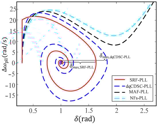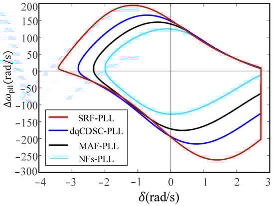 In the domain of large-signal systems, the detection of equilibrium points amidst transient conditions does not guarantee stability during such periods. It is critical to delineate the extent of ‘attraction’ for these points, defined as the domain of attraction. If the initial state and trajectory of the system deviate from this domain, the risk of transient instability becomes imminent. Therefore, the domain of attraction underscores the system’s capability to counteract disturbances, serving as an indispensable index for evaluating system stability [,]. Depicted in Figure 7 are the basins of attraction for the SRF-PLL and three additional filters within the PLL, calculated using the ode45 algorithm and parameters specified in Section 4. The order of the basin areas, ranked from largest to smallest, is SSRF-PLL > SdqCDSC-PLL > SMAF-PLL > SNFs-PLL. This observation implies that as the filter delay time constants increase, the basin area decreases. Larger filter delay time constants exacerbate transient synchronization stability issues.