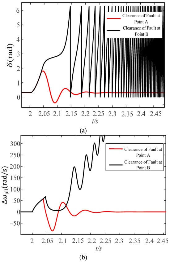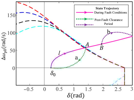 To validate the accuracy of the attraction domain delineated, we consider the NFs-PLL as an exemplar. When the grid voltage plummets to 0.05 p.u, the absence of equilibrium points in the system signifies instability. The trajectory during the fault event is depicted [,] as curve l in Figure 8. Subsequently, upon reaching point A after 37.62 ms, coinciding with the fault clearance, the system follows trajectory a, ultimately reverting to the equilibrium point. However, upon reaching point B after 45.2 ms, although the fault is rectified, the post-fault trajectory deviates along path b, resulting in transient instability. The attraction domain illustrated in this study exhibits a degree of conservatism. However, this conservative approach provides a safety buffer in fault detection and clearance, mitigating the risk of undetected GFL instability resulting from grid faults. This, in turn, helps prevent situations where protective devices fail to trigger, thereby averting the escalation of faults.