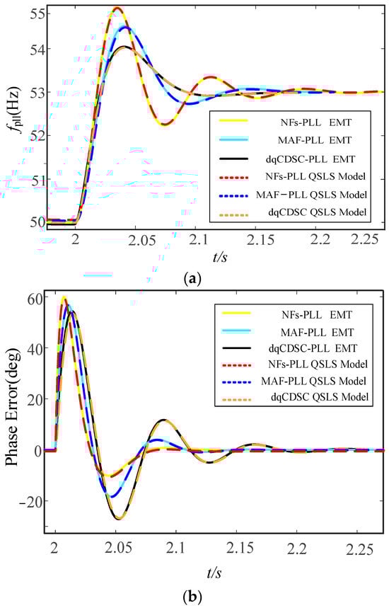 To enhance the validation of the reduced-order [] models of the PLL incorporating three additional filters, a series of simulation experiments mimicking extreme grid faults is designed as follows: Scenario (1) entails a +3 Hz step change in the grid frequency at 2 s, whereas Scenario (2) involves an abrupt phase jump of +40° in the grid at 2 s. Subsequently, the reduced-order models are juxtaposed with the simulation outcomes of the third-order PLL QSLS model. The transient responses of the PLL frequency and the grid-phase error with the three additional filters are depicted in Figure 10 for further analysis.
