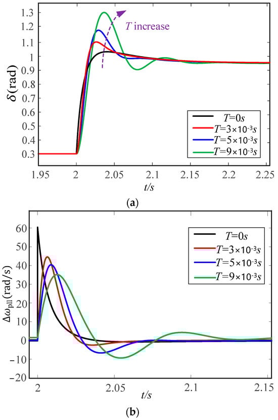 where t2 and t3 denote the time needed for the inertial element and the PI controller output response to attain steady-state, respectively. Owing to the delayed response of the inertial element, t1 the time required for the PI controller to rectify the same error is shorter than t3. Furthermore, as the time constant T of the inertial element increases, the output voltage decreases, leading to an increase in integration accumulation and an elongation of the time t2 required to reach a steady state. Consequently, this results in a larger transient peak phase of the PLL. Therefore, the inclusion of the inertial element exacerbates synchronization stability.