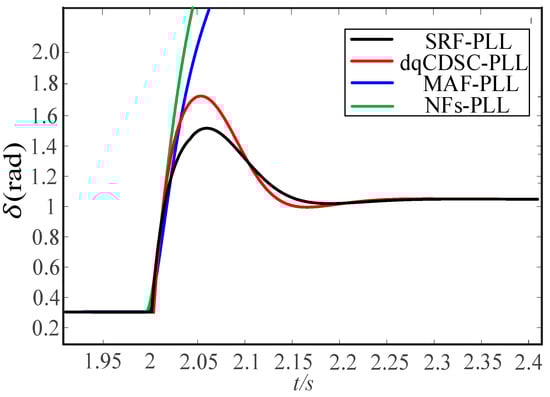 Figure 13 presents a comparative analysis of the phase responses between the SRF-PLL and PLLs augmented with three additional filters, with the grid voltage dropping to 0.35 p.u. While the SRF-PLL and the dqCDSC-PLL featuring smaller filter time constants maintain synchronization with the grid during this fault scenario, the incorporation of dqCDSC filters exacerbates the synchronization stability issues of the GFL. Conversely, the MAF-PLL and NF-PLL, characterized by larger filter time constants, exhibit transient instability under similar fault conditions. Consequently, caution is advised when deploying MAF-PLL and NF-PLL configurations during severe grid faults.