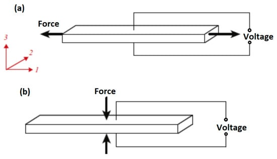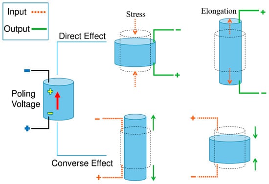 An essential component of an energy harvester is its energy conversion efficiency, which is vital for design optimization and comparative assessments. Power conversion efficiency denotes the ratio of the output electrical energy to the input energy of the system. For piezoelectric energy harvesters (PEHs), this ratio, called electromechanical coupling, represents the output electrical energy against the input mechanical energy [27,28]. A piezoelectric transducer has two effects, either direct or indirect. The direct effect occurs when stress is applied to piezoelectric materials, which produces charges on the surface of piezoelectric materials. The converse piezoelectric effect occurs when an electrical field is applied across the surface of piezoelectric materials and induces stress across the surface. Figure 1 shows the direct and converse piezoelectric effect [29,30].