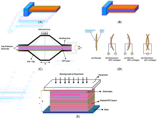 The mechanism of PEH is based on the direct piezoelectric effect, i.e., if the harvester is subjected to stresses, charges will be generated on the materials’ surface proportionally. In contemporary times, energy harvesting and storage represent critical technologies within the power domain, offering the potential to replace batteries or significantly prolong their lifespan. Around the early 2000s, the optimal design significantly impacted power output, hinging on factors such as the shape, type, and positioning of piezoelectric materials when affixed to beam structures. The most straightforward approach to enhance power output from any piezoelectric material involves devising a flexible mechanism for the piezoelectric harvester and strategically arranging the harvester elements [61].