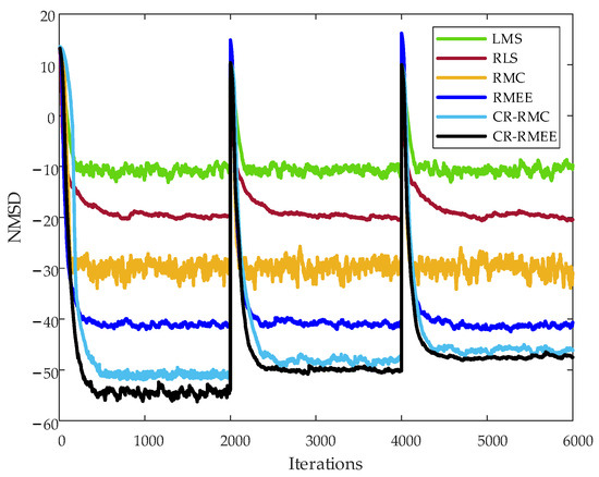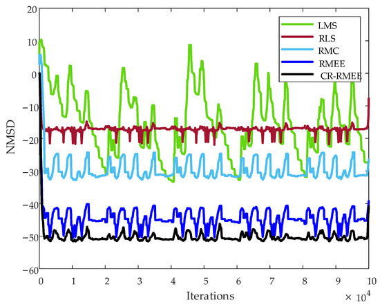 Firstly, we present the performance of the CR-RMEE algorithm in a stationary sparse environment. For comparison, we also present the performance of the LMS algorithm, RLS algorithm, RMC algorithm, and the original RMEE algorithm. We set the unknown system as a sparse system with S = 1. For the RMC algorithm, RMEE algorithm, CR-RMC algorithm, and our proposed CR-RMEE algorithm, the same is chosen. Moreover, the step size for the LMS algorithm is 0.01. As for the choice of , RLS, RMC, RMEE, CR-RMC, and CR-RMEE algorithms are, respectively, chosen as , , , , and . As we can see from Figure 1, it is evident that, with the initial convergence rates of various algorithms set to be similar, the NMSD of the LMS, RLS, and RMC algorithms is relatively large. Additionally, both the LMS and RMC algorithms exhibit significant fluctuations after convergence. Although both the RMEE and CR-RMC algorithms have very small NMSD values, the RMEE algorithm exhibits faster convergence, while the CR-RMC algorithm ultimately achieves a lower steady-state error. Compared to the LMS and RMC algorithms, our proposed CR-RMEE algorithm shows significantly reduced fluctuations within an acceptable range. Combining the advantages of the fast convergence of the RMEE algorithm and the low steady-state error of the CR-RMC algorithm, the CR-RMEE algorithm even achieves the lowest NMSD. This simulation experiment demonstrates that our proposed new algorithm exhibits excellent performance in a steady sparse environment.
