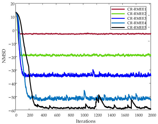 Thirdly, we vary the parameter (σ, λ) for the CR-RMEE algorithm to test its impact on algorithm performance. All simulation results are the average of 200 independent runs, so we can only obtain an approximate value. The experimental results are shown in Table 1. To more intuitively illustrate the effect of different parameters on algorithm performance, we have selected a set of obvious results in graphical form, as shown in Figure 3. The parameters for CR-RMEE1, CR-RMEE2, CR-RMEE3, CR-RMEE4, and CR-RMEE5 are [σ = 3, λ2 = 0.942], [σ = 2, λ2 = 0.970], [σ = 1, λ2 = 0.980], [σ = 0.5, λ2 = 0.992], and [σ = 0.2, λ2 = 0.994]. Combining Table 1 and Figure 3, it can be observed that the NMSD of the algorithm is negatively correlated with the value and positively correlated with the λ2 value. As the steady-state error decreases, the convergence speed of the algorithm gradually slows down, and the level of post-convergence oscillation also gradually increases. This indicates that achieving a lower steady-state error often requires sacrificing the algorithm’s convergence speed and stability. Therefore, in practical applications, it is necessary to adjust the parameters judiciously to achieve the best performance. Additionally, from Table 1, it can be seen that the steady-state error of the CR-RMEE algorithm in Figure 1 is approximately −49.6 dB when [σ = 1, λ2 = 0.996].