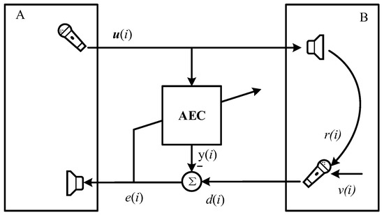 Finally, to demonstrate the performance of the CR-RMEE algorithm in practical applications, we consider an echo cancellation application, whose basic structure is as shown in Figure 5. The generation principle of acoustic echo is mainly due to the sound from room A being transmitted to room B through channels such as wired or wireless, played through a speaker. After a series of acoustic reflections, the sound carries the inherent noise in room B and is picked up by the microphone, then transmitted back to room A. Acoustic echo can cause speakers in room A to hear their own speech shortly after speaking, significantly impacting the communication quality. In such cases, echo cancellation aims to eliminate these effects as much as possible. The mathematical model of echo cancellation is as follows: the far-end signal u(i) from room A, when transmitted to room B, generates the echo signal r(i) after multiple reflections. Finally, the near-end signal, carrying the echo signal r(i) and the noise v(i) from room B, is combined to produce d(i). The Acoustic Echo Canceller (AEC) module processes the far-end signal u(i) to obtain y(i) (the echo signal). By taking the difference between d(i) and y(i), the error e(i) is obtained and passed to the adaptive filter (AEC module), leading to iterative updates of the filter coefficients. A smaller error indicates better echo cancellation effectiveness.