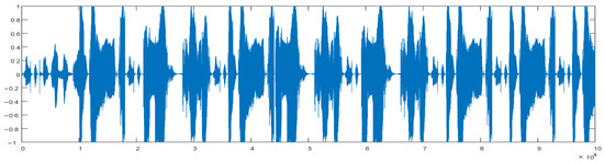 In this simulation, the input was changed to a real speech signal with a sampling rate of 8 kHz, as shown in Figure 6. The additive noise is impulsive with a mixed Gaussian distribution, v(n) ~ 0.95N(0,0.01) + 0.05N(0,5). The parameters used for each algorithm were the same as in Figure 1. From Figure 7, it can be observed that, when the input is real speech, the convergence curves of various algorithms exhibit noticeable fluctuations, especially the LMS algorithm. Although the RMC and RMEE algorithms also have relatively small steady-state errors, the fluctuations are still evident. Our proposed CR-RMEE algorithm not only has smaller fluctuations but also the minimum steady-state error, indicating its superior performance.
