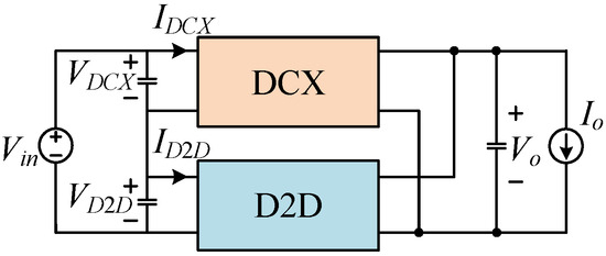 The concept of the Sigma converter, as a type of special ISOP converter, was proposed by Dr. Xu [11]. The Sigma converter is composed of an unregulated converter and a regulated converter. The unregulated converter acts as a DC transformer (DCX), and the regulated converter acts as a DC/DC (D2D) converter, as shown in Figure 1. Based on this concept, which is different from the normal ISOP structure with an identical submodule, a hybrid ISOP converter consists of a DAB converter as a D2D converter and several series resonant converters (SRCs) as a DCX [12]. An LLC converter can also be used as a DCX to improve system performance [13,14].