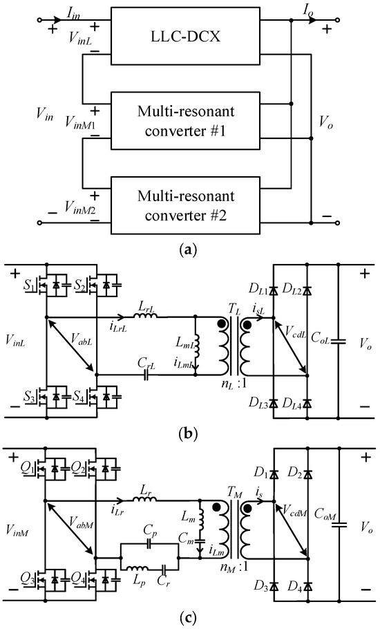 The topology of the proposed Sigma converter is shown in Figure 2. The Sigma converter combines two multi-resonant converters with an LLC–DCX converter through an input-series output-parallel (ISOP) structure. Among them, the two multi-resonant converters share the same parameters. Figure 2a shows the overall structure. The input voltage of the Sigma converter (Vin) includes three parts, i.e., VinL, VinM1, and VinM2. They are the input voltages of the LLC–DCX converter, multi-resonant converter #1, and multi-resonant converter #2, respectively. Moreover, Iin, Io, and Vo are the input current, output current, and output voltage, respectively, of the Sigma converter.