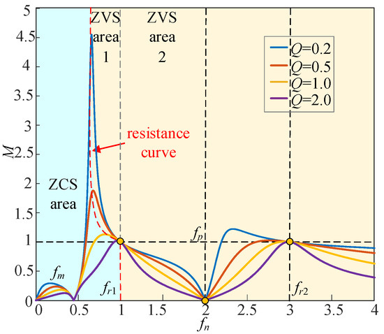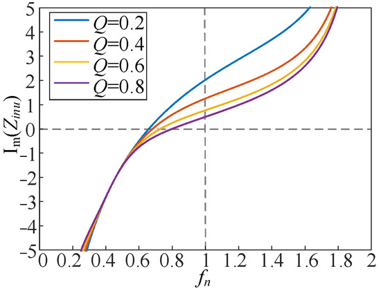 From the perspective of the input impedance, the curves of Im(Zinu) are as shown in Figure 13. As the value of Q becomes larger, the frequency range corresponding to the inductive input impedance gradually shrinks, making it harder to realize ZVS. Hence, Q should be small for ZVS.