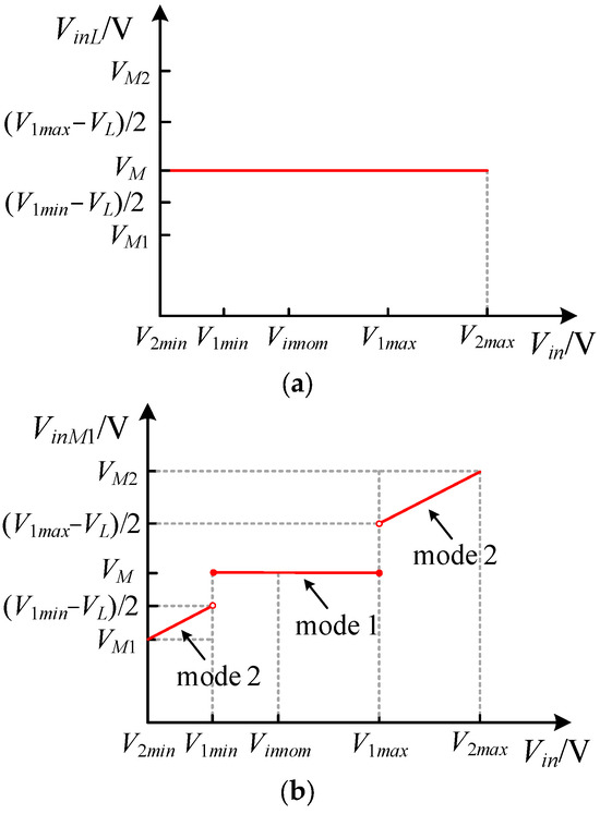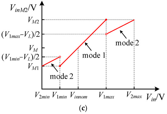 For each submodule, the input voltage is relevant to Vin, and the relationship curves are as shown in Figure 7. In this case, the LLC–DCX converter always operates at the resonant frequency, and its input voltage VinL is always constant. The input voltages VinM1 and VinM2 of multi-resonant converter #1 and multi-resonant converter #2 vary with the input voltage of the Sigma converter and operate in different modes.