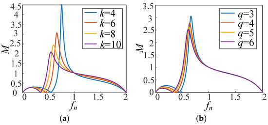 Curves of voltage gain changing with k and q. (a) M changing with k; (b) M changing with q.