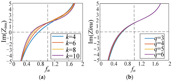 Curves of imaginary part of input impedance. (a) Im(Zinu) changing with k; (b) Im(Zinu) changing with q.