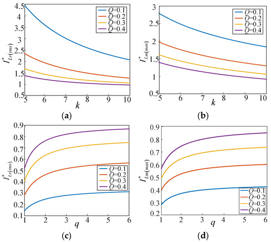 Curves of I*Lr(rms) and I*Lm(max). (a) I*Lr(rms) changing with k; (b) I*Lm(max) changing with k; (c) I*Lr(rms) changing with q; (d) I*Lm(max) changing with q.