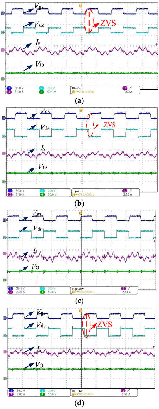 Figure 14 shows the steady-state experimental waveforms of the multi-resonant converter under different parameter conditions. In Figure 14, Vgs is the gate drive signal of Q1, Vds is the drain–source voltage of Q1, Is is the secondary side current, and Vo is the output voltage. From Figure 14, it can be seen that Vds is reduced to 0 before Vgs is turned on, indicating that the power switching tube is capable of realizing ZVS. By comparing Figure 14a with Figure 14d, it can be seen that with the quality factor Q and the resonant capacitance ratio, q, remains unchanged; when the input voltage is constant, the output voltage Vo decreases significantly with the increase in k, i.e., the voltage gain M decreases. Similarly, comparing Figure 14b with Figure 14d, it can be concluded that with the resonant inductance ratio k and resonant capacitance ratio q kept constant, when the input voltage is constant, the output voltage Vo also decreases with the increase in Q, i.e., the voltage gain becomes smaller. Similarly, comparing Figure 14c and Figure 14d, it can be seen that the output voltage Vo decreases slightly with the increase in q when the resonant inductance ratio k, the quality factor Q, and the input voltage are kept constant, and the effect of q on the voltage gain is relatively small. Based on the above comparative analysis, the experimental results are consistent with the theoretical analysis in Section 4.2.
