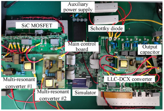 A 2 kW experimental prototype of the proposed Sigma converter is built with 540~1100 V input and 48 V output voltages, as shown in Figure 16. The detailed specifications are listed in Table 4. TMS320F28377D is chosen as the digital signal processor (DSP) for system control.
