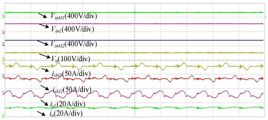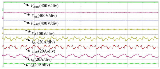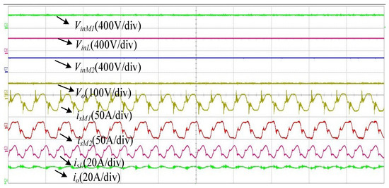 Figure 19 shows the steady-state experimental waveforms when the input voltage is 1100 V. When the input voltage is between 925 and 1100 V, multi-resonant converter #1 operates in the D2D mode, i.e., the Sigma converter operates in mode 2. At this point, the input voltage of the two multi-resonant converters is 1/2 × (Vin − VinL). As can be seen in Figure 19, the input voltage of the LLC–DCX converter is 270 V, and that of the two multi-resonant converters is approximately 415 V, which is consistent with the theoretical analysis.