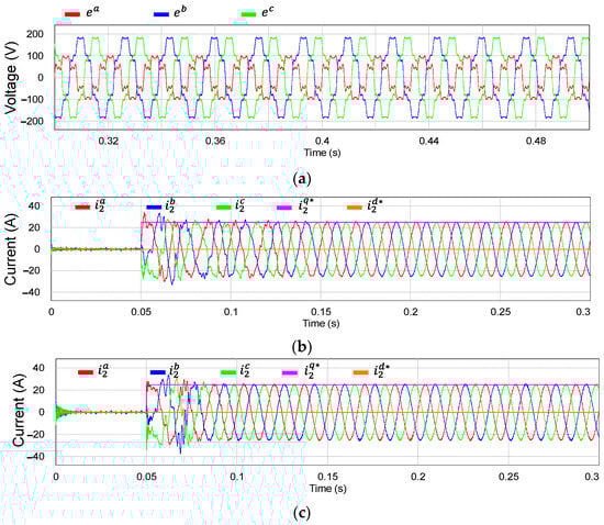 Current responses of the proposed current controller under grid voltage distortion/imbalance and the current reference of 25 A. (a) Grid voltages. (b) Current response at the start-up instant with grid inductance Lg = 4 mH. (c) Current response at the start-up instant with filter capacitance Cf = 6 μF.