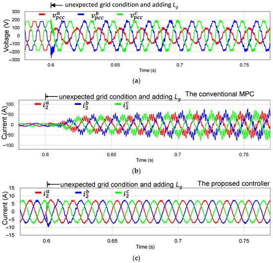 Comparison results between the conventional MPC in [6] and the proposed controller under unexpected grid conditions such as grid impedance ( = 4 mH) and grid voltage distortion/imbalance ( drops to 50% of the nominal value at 0.6 s). (a) PCC voltages. (b) Grid currents of the conventional MPC. (c) Grid currents of the proposed controller.