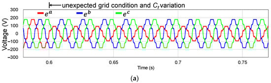 Figure 5 represents the grid current responses produced by the proposed control method by the simulation when the utility grid voltages include distortion and frequency change. The waveform in Figure 5a shows the high-quality grid currents even under harsh disturbance from the grid. Figure 5b shows the current responses when additional grid impedance ( = 4 mH) is applied in addition to distorted grid voltages and frequency change from 60 Hz to 50 Hz at 0.6 s. The results of Figure 5 demonstrate that the proposed current controller ensures strong robustness and good control response under voltage distortion of the utility grid, grid frequency change, and grid impedance uncertainty.