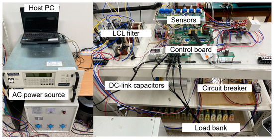 The proposed control method is executed in the lab-based experimental system to prove the performance and robustness by experiments. Figure 10 depicts the experimental test setup, in which the AC programmable power source is employed to realize the distorted and imbalanced utility grid environment. To implement the proposed EMPC-based grid voltage sensorless control, the DSP TMS320F28335 (Texas Instruments, Dallas, TX, USA) is used. To construct the system with the proposed method, DC-link voltage and grid currents in phase-a and -b are measured. The grid voltages are not only contaminated by harmonic distortion, but also imbalanced with drop to 70.56% from the nominal voltage.