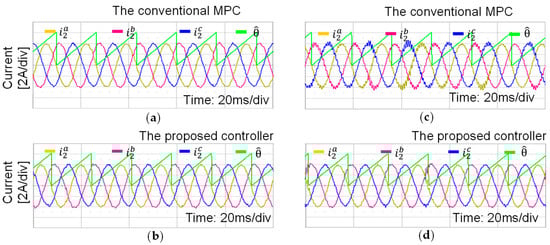 Figure 11 presents the experimental comparison results for steady-state tracking performance between the conventional MPC in [6] and the proposed controller under uncertainty. In these figures, the grid phase angle estimates are also shown to verify the synchronization performance without grid voltage sensors. The conventional MPC in [6] and the proposed control show similar results with 1 μF as shown in Figure 11a,b. In contrast, the proposed control exhibits better current quality and less oscillation than the conventional one with 6 μF as in Figure 11c,d.