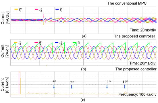 Comparative experimental results between the conventional MPC in [6] and the proposed method under grid voltage distortion/imbalance with grid impedance ( = 4 mH). (a) Conventional MPC. (b) Proposed controller. (c) FFT of phase-a current with the proposed controller.