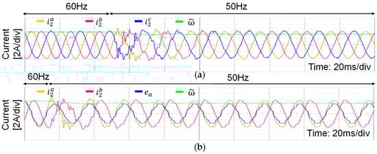The experimental responses in Figure 13 present the transient performance of the proposed method when the utility grid frequency rapidly changes from 60 Hz to 50 Hz. As test conditions, while the grid voltage is distorted in Figure 13a, it is distorted as well as imbalanced in Figure 13b. These results demonstrate that the grid currents are quickly restored to the sinusoidal form even under both grid frequency change and harsh grid disturbance such as imbalance and distortion, which well matches the simulation results in Figure 5. Additionally, the grid frequency estimated by using the MAF-PLL from the estimated grid voltages rapidly tracks new frequency value without a noticeable overshoot. All experimental tests clearly verify the robustness and performance of the proposed method which produces stable and pure sinusoidal grid current even under weak grid and parametric uncertainty without using the measurement of the grid voltages.