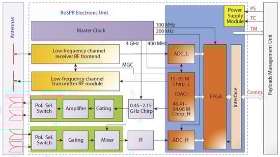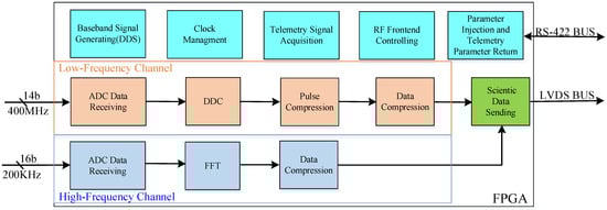 A block diagram of the RoSPR FPGA is given in Figure 2. The low-frequency channel functions are achieved in the digital domain, which is colored in orange in the block diagram. Meanwhile, a superheterodyne receiver is employed in the hardware for the high-frequency channel, and its function is shown in blue in the block diagram. As for the high-frequency channel, the FPGA only needs to complete its echo sampling and data compression. Moreover, the two channels’ data compression is the same. We use the low-frequency channel as an example to introduce the algorithm in detail in the following sections.