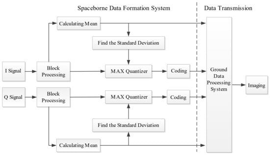 The BAQ quantizers with different bit rates are used to improve the overall compression performance of the TerraSAR-X system [15,16,17]. In view of the approximate Gaussian distribution statistical characteristics for microwave imaging radar data [16], the dynamic range of the signal in a short time interval is much smaller than that of the entire echo data set. After the data are divided into blocks, the dynamic range of most compressed data blocks is reduced [18]. The BAQ algorithm block diagram is shown in Figure 4.