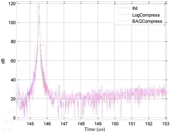 When the input data have no targets (148 μs~153 μs), the noise follows a Gaussian distribution, and BAQ compression performs better than logarithmic compression. However, for targeted data (144 μs~148 μs), due to their high dynamics, the sidelobe compression effect of logarithmic compression is significantly better than that of BAQ. In the later analysis of the RoSPR data, the loss of the echo signal needs to be concerned. The sidelobe loss of BAQ compression has a significant impact on the later data analysis, while the noise loss before and after compression has little impact.
