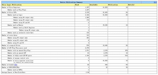 When the algorithm is implemented on the FPGA in ISE13.2, the proportion of resources is evaluated as shown in Figure 7. The registers are only 1% utilized, and the LUTs are only 2% utilized. The proportion of resources used by logarithmic compression in the FPGA is very small, almost negligible [22]. Therefore, it is feasible to implement the logarithmic operation in the FPGA using the method of successive approximation.