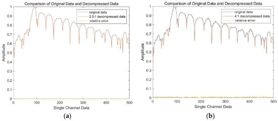 When the crater high-frequency channel data are input, the processing result is similar to that of the of the glacier data, as shown in Figure 10a,b. Compared with the 2.5:1 compression ratio, a higher 4:1 compression ratio will also result in higher compression errors. The maximum relative error before and after single-channel data compression is 1.38%; the compression error is still acceptable compared to the size of the original data.