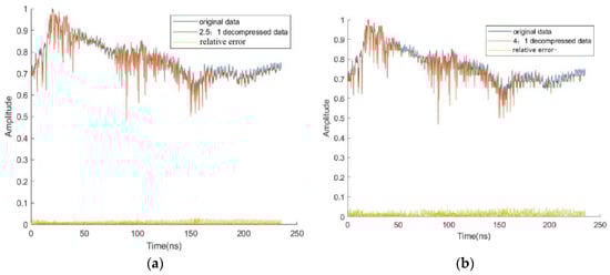 This paper selects the test data of the above two scenarios for a data compression analysis. In order to more intuitively compare the errors of the data before and after compression, one trace data is intercepted and compared before and after compression. A comparison of the two compression ratios of 2.5:1 and 4:1 is shown in Figure 9a,b.