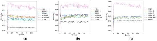 To assess the efficacy of utilizing a constructed sampling space for random vector sampling, this study calculated the similarity between random vectors (noise) and gradient vectors across six methodologies as the number of queries increased, as illustrated in Figure 4. This evaluation was crucial for validating the effectiveness of employing the bilinear interpolation method to compile historical information for sampling space construction. As shown in Figure 4a, on the MNIST dataset, a substantial enhancement in the correlation between gradient and random vectors was observed, with the similarity consistently exceeding 0.2 despite minor fluctuations as the number of queries escalated. Similarly, as depicted in Figure 4b,c for the Imagenet and CelebA datasets, respectively, a significant increase in vector similarity was noted, sustaining levels above 0.04 and 0.05, correspondingly, alongside an upward trend in query volumes.