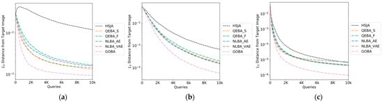 - Adversarial examples crafted using the GOBA method demonstrate superior visual quality. Remarkably, when the L2 norm distance is minimized to a negligible level, these adversarial examples become virtually indistinguishable to the human eye from their original counterparts, yet they significantly impair the classification accuracy of machine learning models. In scenarios involving up to 10,000 queries, the GOBA achieved a reduction in the L2 norm distance between the adversarial and original images of 5.38 × 10−4 for the MNIST dataset, 1.03 × 10−5 for the Imagenet dataset, and an impressive 4.88 × 10−7 for the CelebA dataset. This performance markedly outstrips that of the previous most effective method, the QEBA-S, by achieving an average reduction in perturbation magnitude (measured by the L2 distance) of 54.31%. Thus, the GOBA’s efficacy not only surpasses that of the QEBA-S but also exceeds the capabilities of the other five evaluated methods, highlighting its effective application in generating adversarial examples with minimal perturbation deviations yet a maximal misclassification impact.