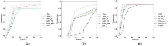 - Superior attack performance of the GOBA: Figure 6 illustrates the attack success rate curves of the six methods for generating adversarial samples on the three datasets. With a query budget of 1 k, the GOBA’s attack success rate on the MNIST dataset is 2.67 times that of the HSJA and 2.28 times that of NLBA-VAE. Under a 1.5 k query budget on the Imagenet dataset, the GOBA’s attack success rate is at least 2% higher than the HSJA and QEBA-S. On the CelebA dataset, it is at least 9% higher. Evidently, the GOBA’s attack success rate surpasses the HSJA, QEBA, and NLBA.