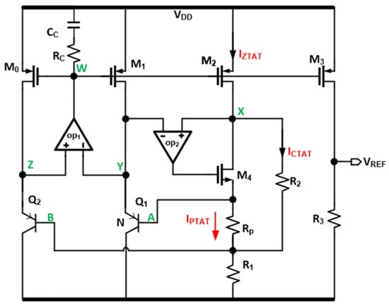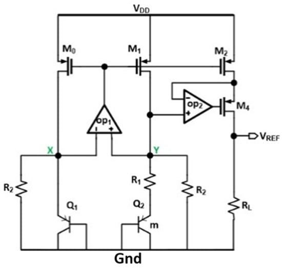 Figure 3 shows the proposed architecture circuit, which consists of two sections. One is a BGR core that generates a PTAT stream consisting of Q1, Q2, OP1, M0, M1, Rp, and the other is a stream adder consisting of OP2, M4, and R2. Note that the start circuit is not shown here for simplicity. Compared to the conventional VBGR, this proposal uses the base connection to generate the PTAT current, thus achieving a kind of curvature compensation []. Since the voltage across RP is VBE2–VBE1, it has a PTAT characteristic. The operational amplifier (OP2) sets the gate voltage of M4 such that VX = VY. Therefore, the voltage across R2 will be VBE2, and the current through R2 will have the properties of CTAT. M2 carries a sum of PTAT and CTAT currents that allows the TC to be set to zero by adjusting the ratio of R2 and Rp. The output voltage is given using Equation (6).
