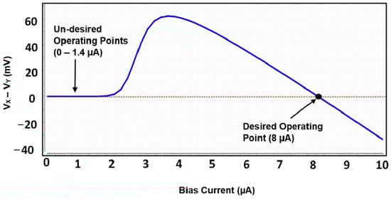By adjusting the ratio of R2 and R1 to minimise TC and adjusting RL to generate the desired output voltage. This CBGR is simple and provides an output voltage of less than 1 V, but it has some problems. The R2 required for zero TC is very large. For example, to bias the BG core to 3 µA, the values of R1 and R2 should be 17 kΩ and 198 kΩ, respectively. Such a large value of R2 occupies a lot of active space, and there are also two instances of R2, and, hence, this is an area-in-efficient [,]. Conventionally, the VBGR has two operating points, a desired and an undesired operating point (zero current). Therefore, a start-up circuit prevents the circuit from getting stuck at zero current. In contrast, CBGR has multiple operating points. This is because when the bandgap core carries little current, Q1 Q2 will not turn on, and most of the current will flow through R2 (Figure 1). Therefore, op1 opamp will sense zero differential voltage until the current is large enough to turn on the BJT. To quantify the operating point, replace M0 and M1 with ideal current sources, you must sweep their values from 0 to 10 µA, and plot the differential input voltage of the opamp as in Figure 2. At a maximum bias current of 1.4 µA, the opamp input terminals will see the same voltage (meaning the BJT is not turned on), indicating that the BGR can operate at any current within 1.4 µA (some undesirable points). When the current exceeds 1.4 µA, the Q1–2 device turns on, and the voltages of nodes X, Y are different for the same current. As soon as the current approaches 8 µA, the opamp op1 input becomes 0 V again, so this is also the operating point (preferred). To avoid these problems, a starter circuit is necessary, and designing the starter circuit is difficult due to the above-mentioned points. It uses a POR circuit to avoid the failure of this circuit []. A small asymmetry in the opamp is used, as shown in Equation (3) (intentionally adding a mismatch to R2) []. This circuit does not have access to the PTAT current like the VBGR circuit, so if PTAT is required, it must be generated by additional circuitry at the cost of more current and mismatch, as given in Equation (4). This architecture also amplifies that there is opamp offset with a large gain compared to the traditional BGR due to the resistor loaded on the input terminal of the opamp. Therefore, a larger gain will amplify any residual input-related offset and affect the output TC. Equations (4) and (5) show the output voltage due to only the opamp offset in VBGR and current-mode BGR, respectively [].
