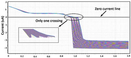 Resistor R1 is not required in this circuit, but its voltage has a non-linear temperature dependence due to the base current, which improves TC. However, R1 increases the minimum power supply required by the circuit, so VR1 < 30 mV for this current research. Even at very low bias currents, the opamp input nodes experience different impedances, so there is no unwanted operating point other than zero current. This is a major advantage of the proposed BGR compared to CBGR. The new proposed circuit has a smaller silicon area than the CBGR (up to 29% savings in silicon area), as only one CTAT register is used. Since R2 does not load the OP1 input, the opamp offset voltage is amplified by the gain, given in Equation (4), which is less than the current-mode BGR. A voltage source was connected to the opamp output (node w), shifted its value from 0 to Vdd, and plotted the current through the voltage source to show the number of operating points. The number of current zero crossing points indicates the number of operating points. Figure 4 shows the current through the voltage source added in the testbench. Since there is only one crossing point in 200 Monte Carlo simulations, this new proposal circuit successfully eliminates all unnecessary operating points (because of the start-up circuit; thus, there is no zero current point).