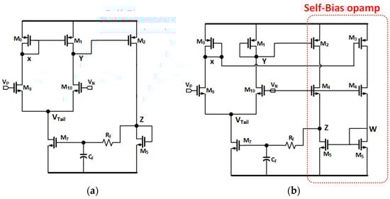 Self-bias opamp schematic for (a) a conventional circuit and (b) the proposed circuit.