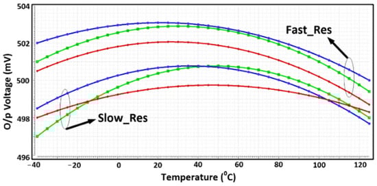 The proposed BGR was implemented in TSMC 28 nm low-power (LP) CMOS technology, which has 10 metals and one poly layer. A low-power process means there is very little leakage current in the off state of the transistor; hence, the threshold voltage of the transistor would be a little higher []. This process contains core and IO transistors to support low- and high-voltage supply. Post-layout simulations based on a resistor coupling capacitor-extracted netlist were performed across NMOS and PMOS typical, NMOS and PMOS fast, NMOS and PMOS slow, fast NMOS and slow PMOS, and slow NMOS and fast PMOS corners. Also, the simulations assumed the PAD capacitance and parasitic interface while connected to the PCB. BGR draws 31.23 µA from the 1.05 V supply. Figure 6 shows the output voltage versus temperature for process corners (TT, FF, SS) and resistance corners (high and low). The output voltage varies from 496.8 to 503 mV over the industrial temperature range (−40 °C to 125 °C) with a TC of 10.5 ppm/0 °C at the FF corner. An interesting observation is that the output voltage is more sensitive to the resistance corner than the MOS corner at a given temperature because the bias current in the BGR core is proportional to RP, which will be changed []. Therefore, two sets of output plots in Figure 6 correspond to the resistance corners.