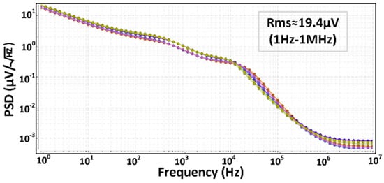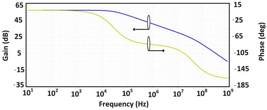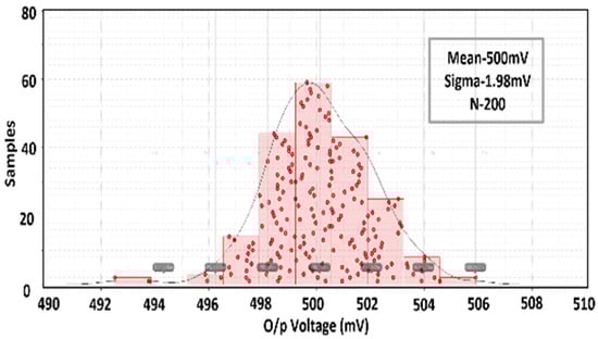Figure 7 shows the output’s simulated noise power spectral density and the integrated RMS noise of ~19.4 μV. Most of the noise is contributed by OP1, Rp, and M0. More importantly, the noise in OP1 is multiplied with R1/Rp. This was reduced by choosing a higher n so that there is less of the multiplication factor, but the trade-off with a very high n increases the risk of the reverse saturation current. Figure 8 shows a simulated histogram of the output voltages corresponding to 6-Sigma 200 Monte Carlo simulations [], indicating a standard deviation of 1.98 mV and an accuracy of 1.21%. Note each point in the histogram is a single Monte Carlo simulation. Figure 9 shows the simulated gain and phase of the proposed self-bias opamp [].