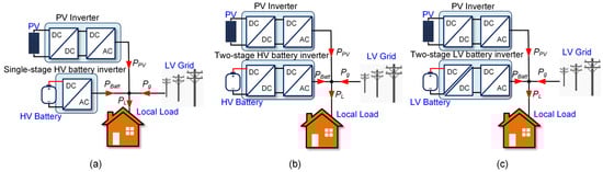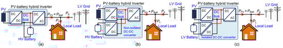 DC coupling grid-connected PV-battery hybrid inverters: (a) direct connection of the HV battery to the DC bus; (b) HV battery connected to the DC bus via a non-isolated DC-DC converter; (c) LV battery connected to the DC bus via an isolated DC-DC converter.