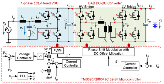 This study focuses on a two-stage single-phase grid-connected LV battery inverter for small residential applications. A dual-active bridge DC-DC converter with phase-shift modulation strategies is generally employed as the bidirectional isolated DC-DC converter for the LV battery pack. Meanwhile, LCL-filtered grid-connected voltage source converters (VSCs) are commonly adopted as the grid-interfaced inverter. However, a limited zero-voltage switching (ZVS) range of the DAB DC-DC converter causes a low efficiency if the voltage ratio between the sides deviates from the nominal value [14]. The efficiency of the DAB DC-DC converter can be enhanced by adding resonant networks to the MF transformer to increase the ZVS range [15,16]. However, power transfer of the resonant DAB DC-DC converter can be controlled by variation of the switching frequency, which is more complicated compared to the fixed frequency operation of the conventional DAB DC-DC converter. The DAB DC-DC converter is sensitive to an imbalance in the voltage-second applied to the MF transformer, which causes a DC offset in the transformer current [17]. The primary and secondary currents of the transformer were sampled 10 times over a switching period to determine the DC offset component, from which the DC offset was compensated through the duty ratios applied to the two active bridges. This method can attenuate the dynamic and static DC offset components [18]. For simplicity, the dynamic DC offset compensation can be embedded into the modulation scheme, where the phase angle of each leg of the DAB DC-DC converter is independently controlled [19,20]. These dynamic DC offset compensation methods require only delay elements.